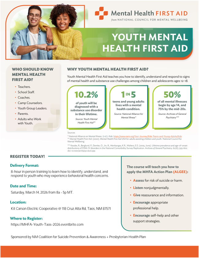 Free Youth Mental Health First Aid Training in Taos on March 14thBy Paul Jenkins / March 1, 2026 Tell others what you have found Like this:Like Loading...