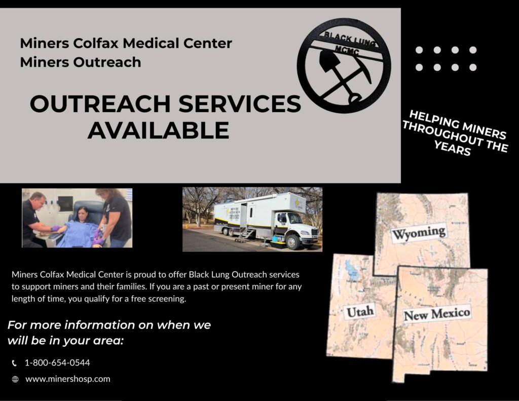 Miners Colfax Medical Center is proud to provide outreach and free health screenings for miners across New Mexico, Utah, and Wyoming. Our mobile outreach unit brings important respiratory and occupational health services directly to communities.
