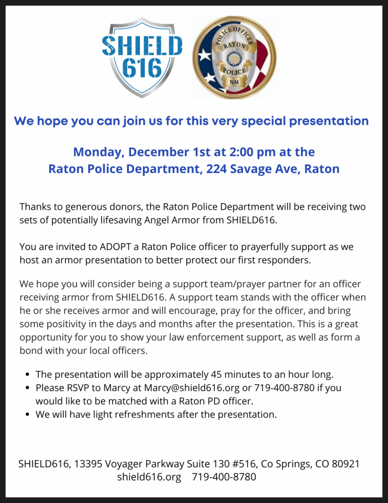 Shield 616 will award two sets of potentially lifesaving Anger Armor awards to the Raton Police Department, located at 224 Savage Avenue in Raton, on Monday, December 1st at 2 p.m. See flyer below for details.