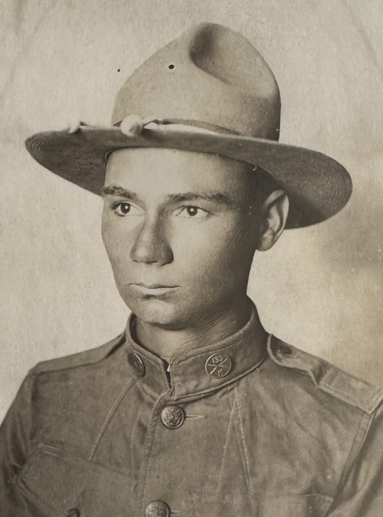 In April 1917, the United States entered World War I, declaring war on Germany. On June 5, 1917, known as National Draft Day, Private (PVT) Benjamin Dallas enlisted in the United States Army and answered the call to serve. The following spring, at the age of 22, he left his family farm in Hayden, New Mexico, and traveled to Camp Cody, New Mexico, for his initial Army training.